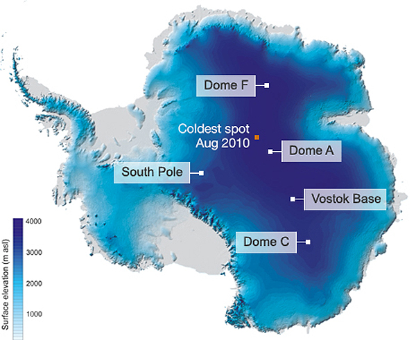 The cold pockets run in a line for hundreds of kilometres between Dome Argus [Dome A] and Dome Fuji [Dome F]. They all achieve more or less the same low temperature between minus 92C and minus 94C. The minus 93.2C figure is the temperature event in which the team has most confidence. It was recorded at a latitude of 81.8 degrees South and a longitude of 59.3 degrees East, at an elevation of about 3,900m.