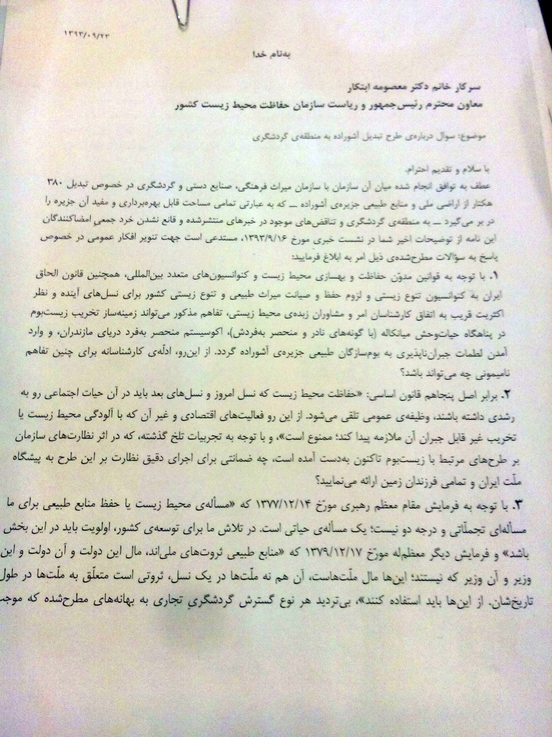 23 آذر ماه جمعی از تشکلهای مردمنهاد در نامهای به معاون رییس جمهور و رییس سازمان حفاظت محیط زیست با طرح سوالاتی دلایل انعقاد تفاهمنامه اخیر سازمان محیط زیست با سازمان میراث فرهنگی را در خصوص آشوراده جویا شدند؛ نامه 2 صفحهای که کمتر از 48 ساعت توسط معصومه ابتکار و تیم کارشناسانش در 4 صفحه و به تفصیل به آن پاسخ داده شد.