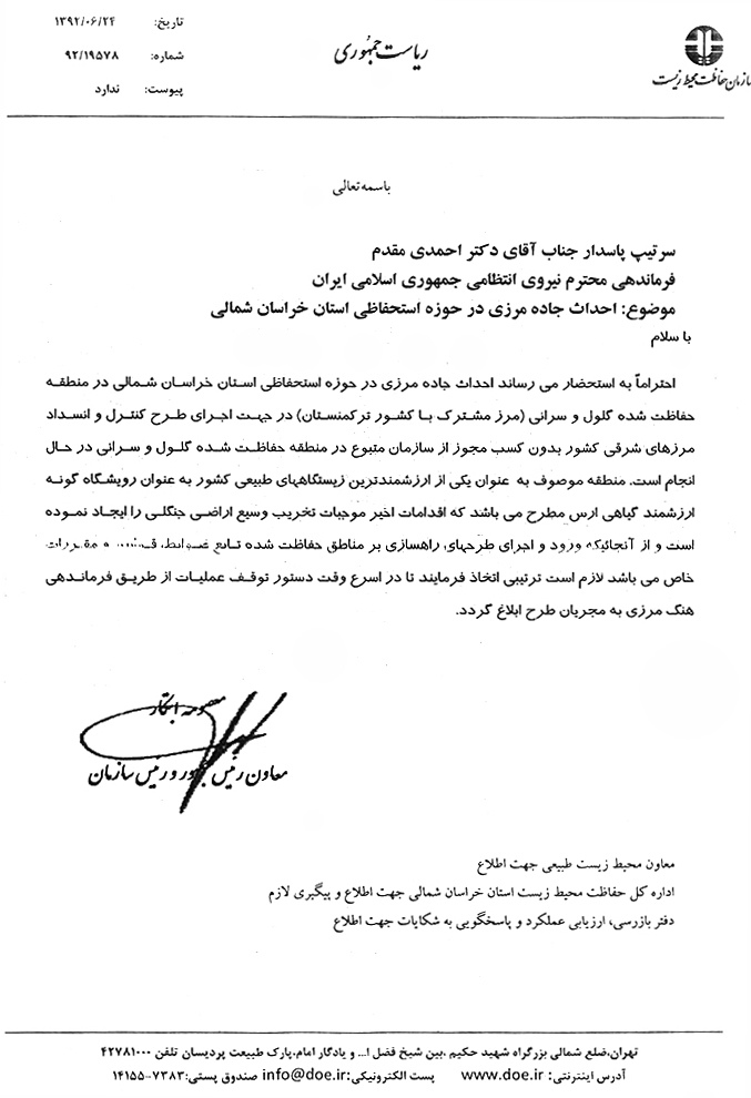 در این نامه آمده است: احداث جاده مرزی در حوزه استحفاظی استان خراسان شمالی در منطقه حفاظت شده گلول و سرانی (مرز مشترک با کشور ترکمنستان) در جهت اجرای طرح کنترل انسداد مرزهای شرقی کشور بدون کسب مجوز از سازمان متبوع در منطقه حفاظت شده گلول و سرانی در حال انجام است.