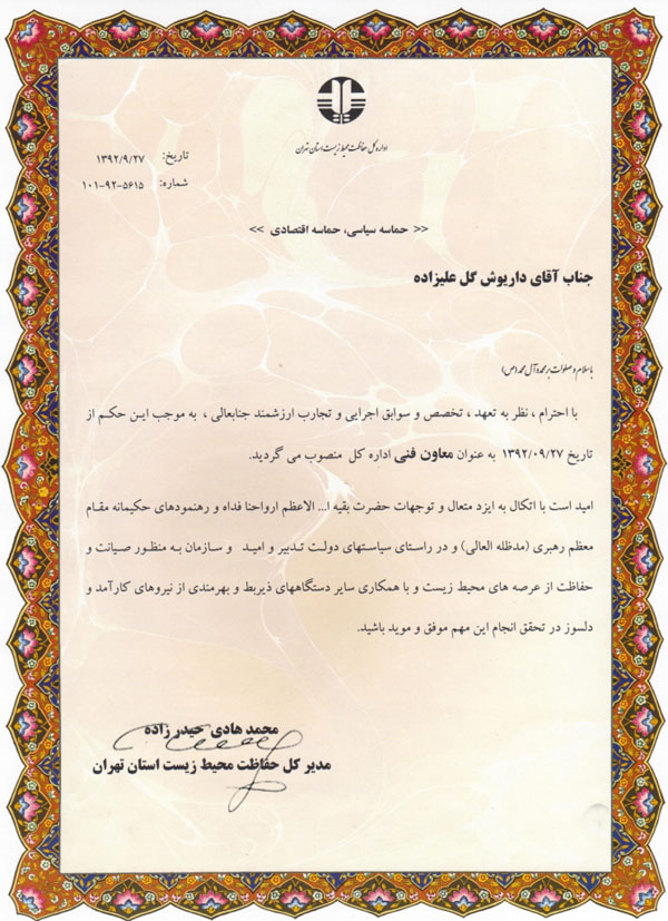 داریوش گل‌علیزاده به عنوان معاون فنی اداره کل محیط زیست استان تهران منصوب شد.